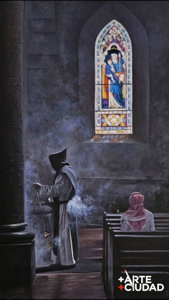 Realizada en óleo sobre lienzo (1.20 x 80 cm), Incienso nos introduce en un escenario que evoca una arquitectura de carácter gótico, con claras referencias a la tradición católica. Sin embargo, el verdadero eje de la obra no está en el espacio, sino en sus protagonistas: dos figuras que representan credos distintos —un católico y un musulmán— compartiendo un mismo entorno sagrado.