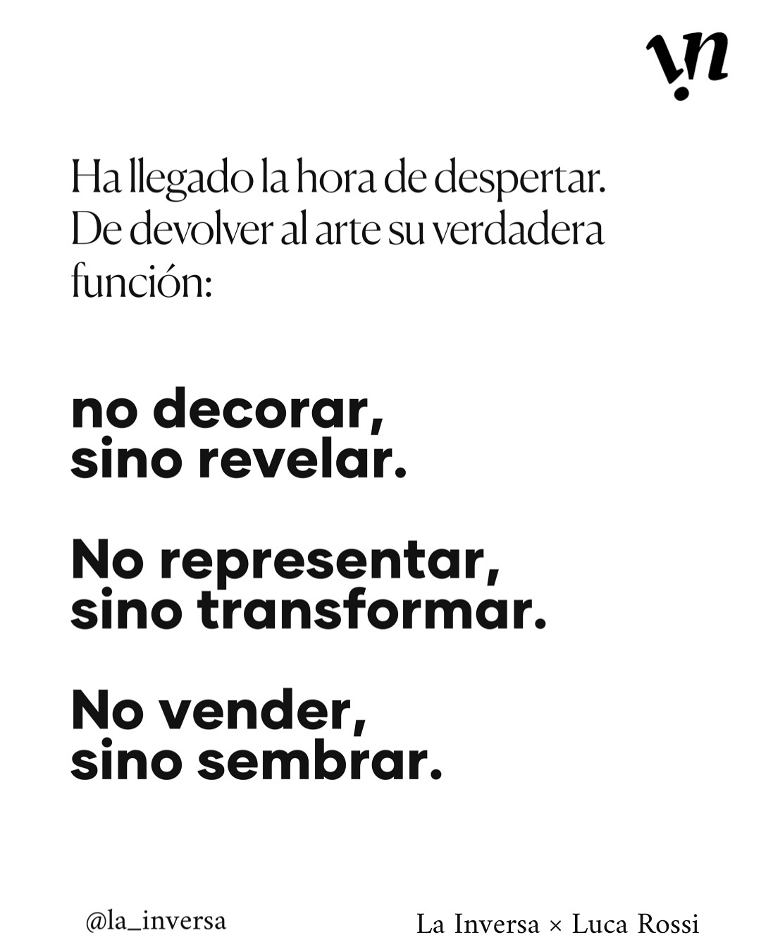 Como advierte Luca Rossi: “si no nos ocupamos del arte contemporáneo, Lo peor del arte contemporaneo se ocupará de nuestras vidas.” Ha llegado la hora de despertar. De devolver al arte su verdadera función: no decorar, sino revelar. No representar, sino transformar. No vender, sino sembrar.